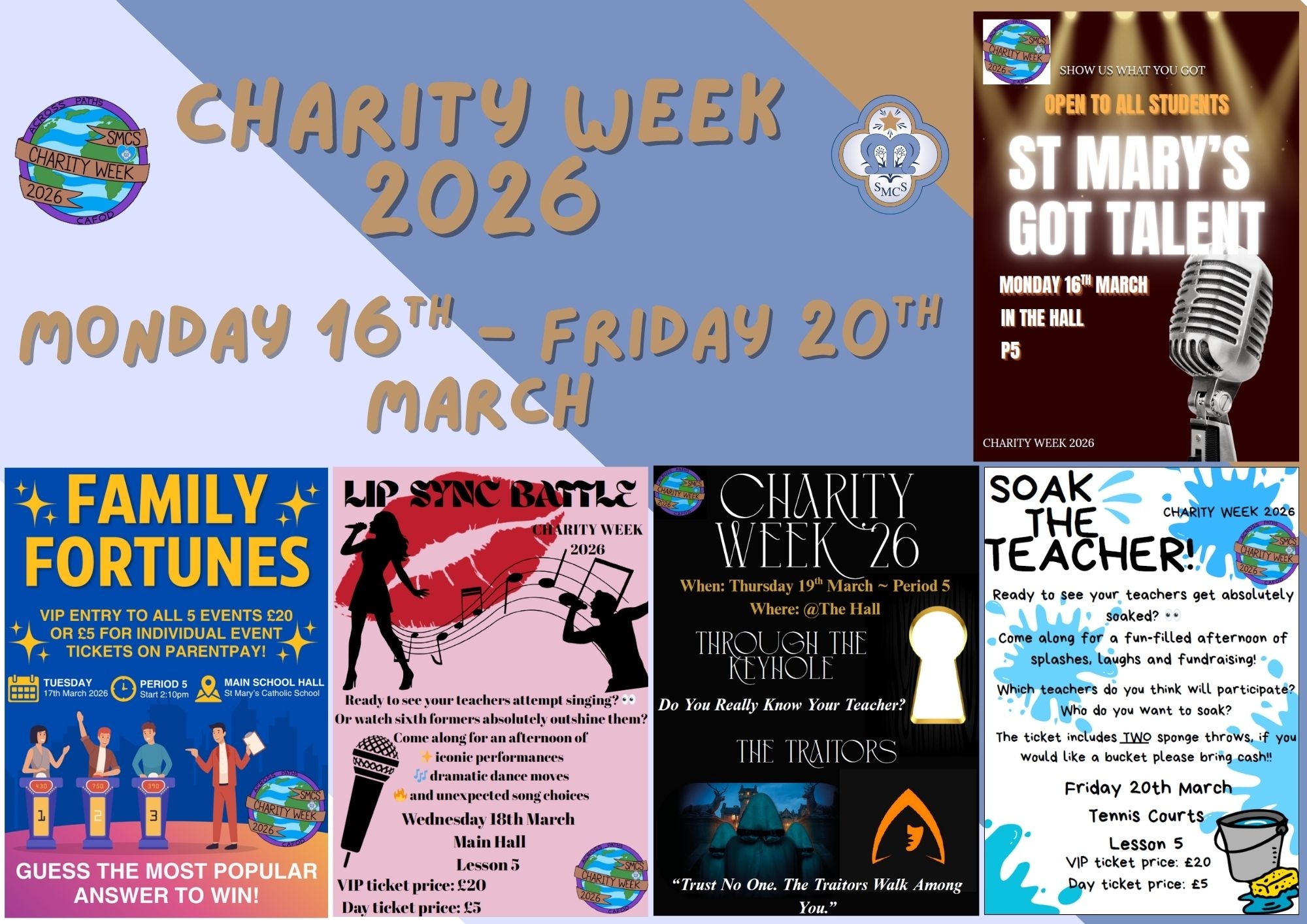 Charity Week 2026 was a truly uplifting and joyful occasion for the whole school community. The events organised and led by our committed and enthusiastic Year 12 Mission Team brought energy, laughter and a strong sense of community spirit to the school. From the excitement of St Mary’s Got Talent, Family Fortunes, Through the Keyhole and The Traitors, to the highly anticipated Lip Sync Battle between staff and Sixth Form students and the ever-popular Soak The Teacher event; there was something for everyone to enjoy.